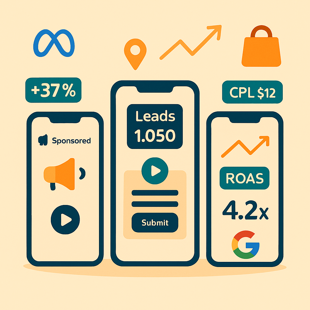 Consistent short-form + targeted Facebook/Instagram ads to an updated website.